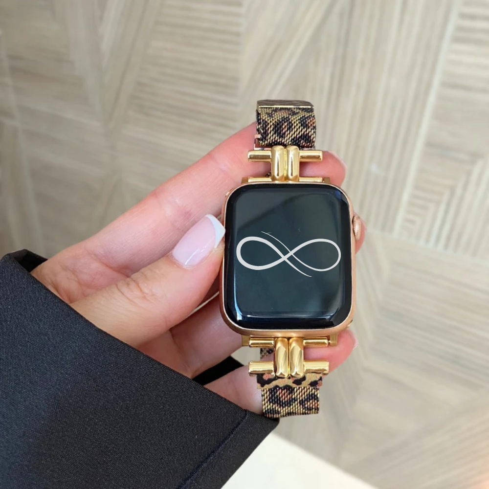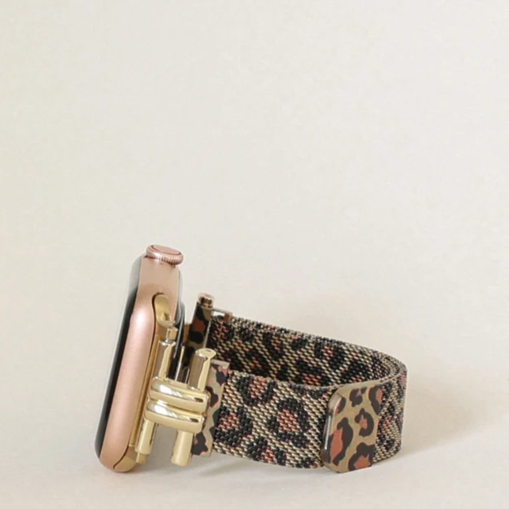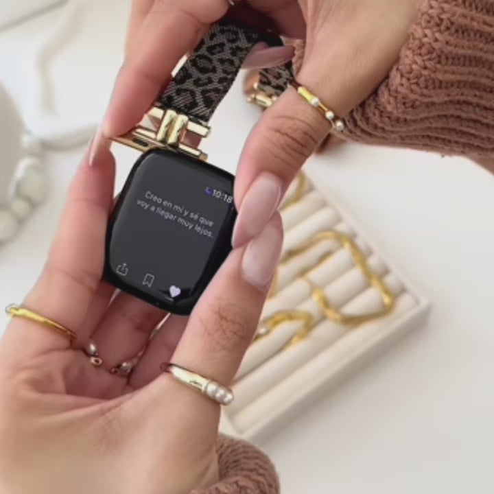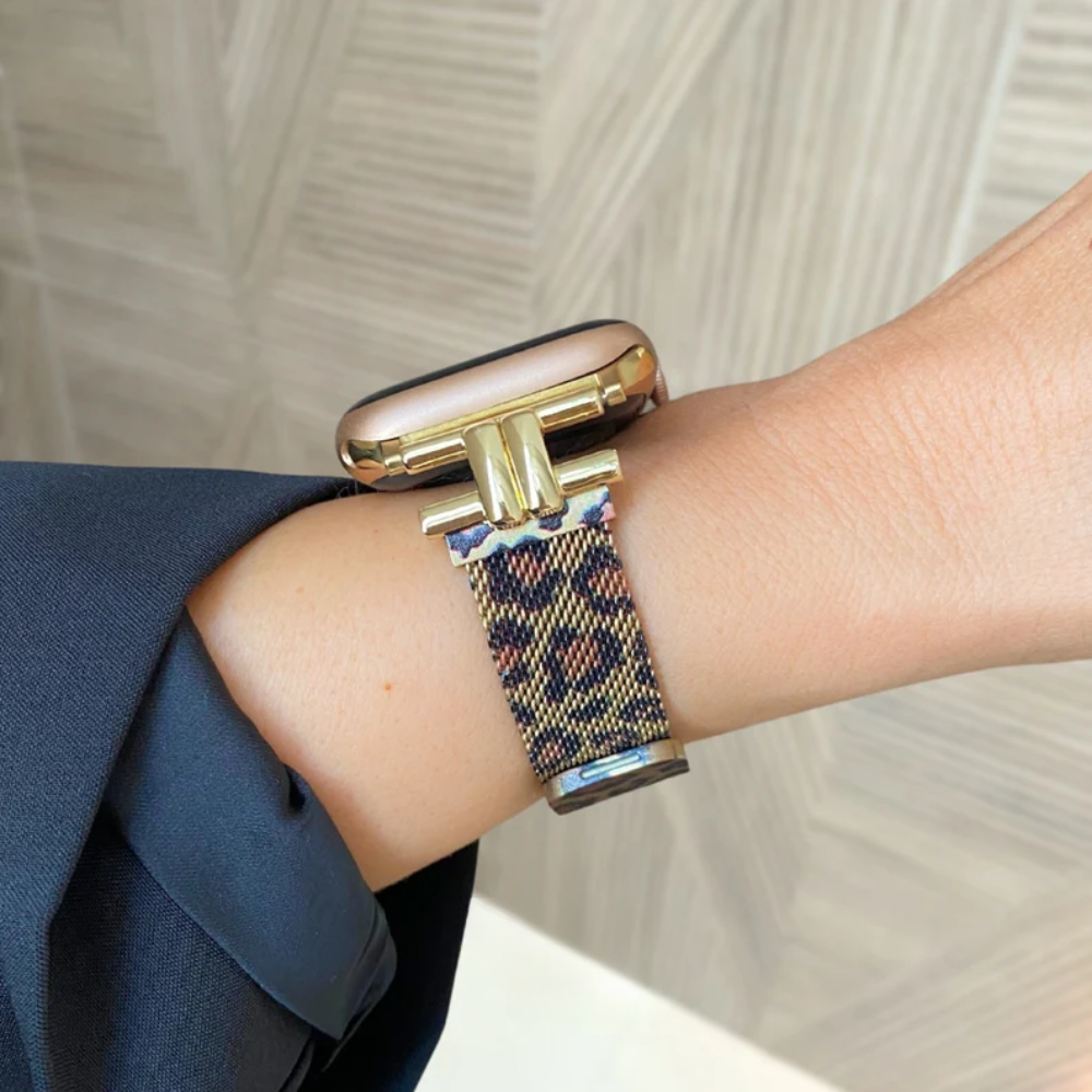 Féra Milano es una correa milanesa con carácter: delgada, magnética y con un sutil estampado tipo leopardo que combina elegancia y audacia en cada detalle. Su cierre de acero inoxidable asegura un ajuste preciso, mientras que su diseño ultrafino se adapta con ligereza y comodidad a todas las versiones de Apple Watch, de 38mm a 49mm.