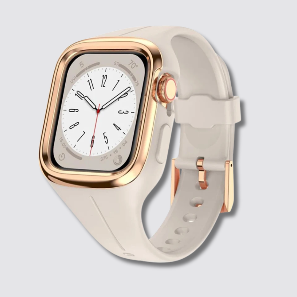 Silvara SportFrame es una correa de silicona suave con funda protectora integrada y marco metálico brillante, ideal para dar a tu Apple Watch un look deportivo, sofisticado y resistente.