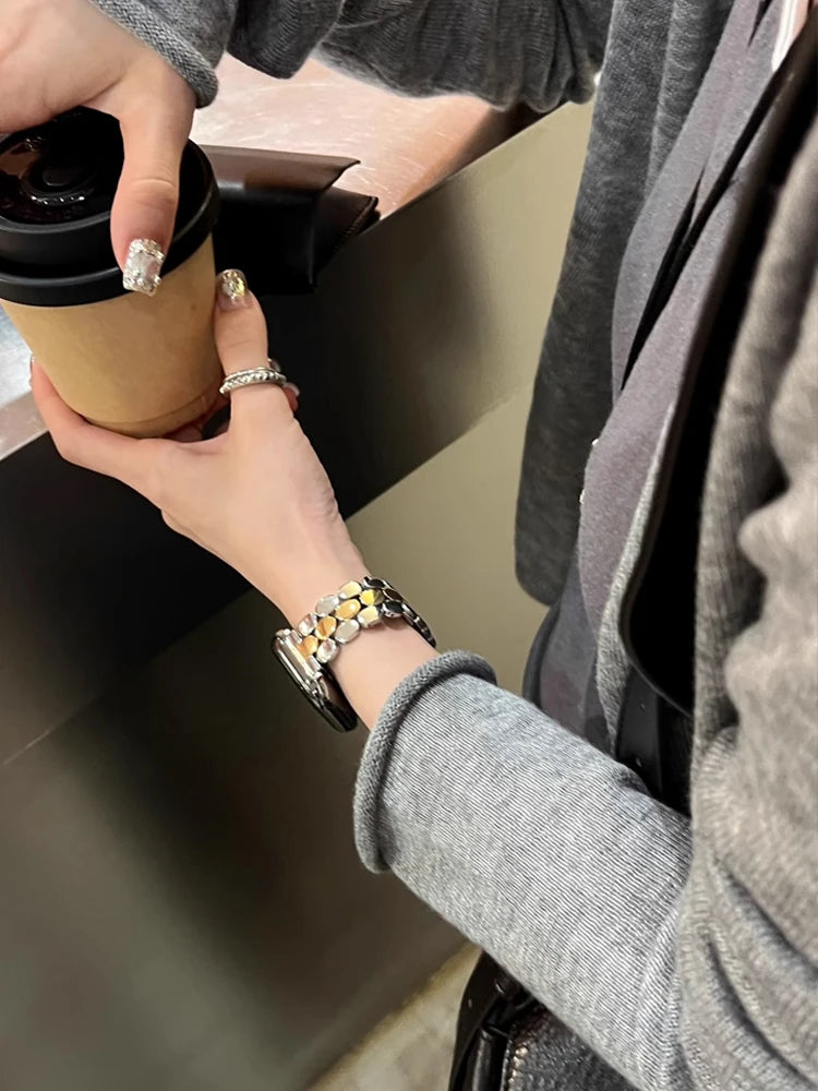 Cada eslabón ha sido elaborado y pulido con procesos de alta precisión, logrando un tacto suave y un movimiento fluido en la muñeca. Su cierre de seguridad con doble bloqueo proporciona un ajuste firme sin comprometer la comodidad.